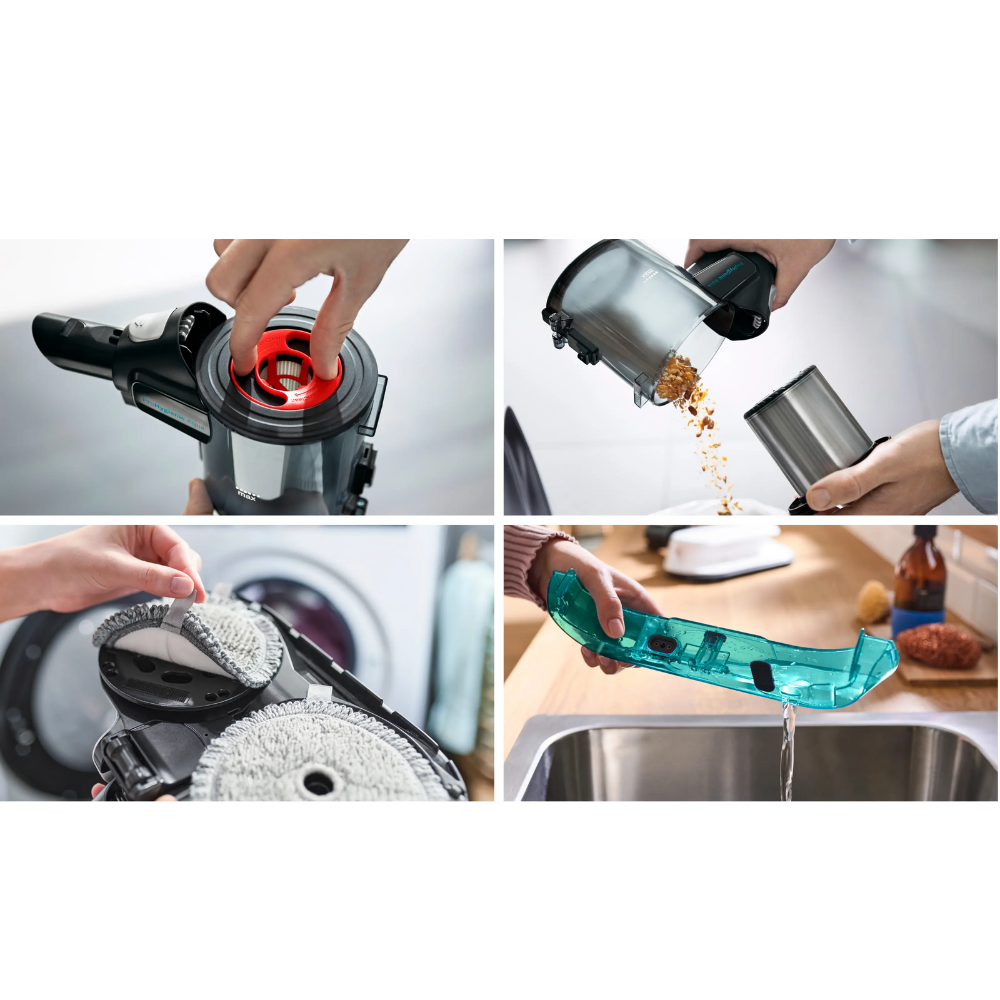 Bosch bežični štapni usisivač s pranjem donosi napredno 2u1 rješenje koje kombinuje snažno usisavanje i temeljito pranje podova u jednom potezu. ProHygienic Aqua sistem s HEPA filtracijom osigurava visoki nivo higijene i čišći zrak u prostoru. Rotirajući jastučići Power Spinning uz automatsko doziranje vode omogućavaju efikasno uklanjanje tvrdokornih mrlja, dok fleksibilna cijev Flex Tube olakšava čišćenje teško dostupnih mjesta. AllFloor DynamicPower četka s integrisanim LED svjetlima sakuplja više od 99,9 % prašine, a izmjenjiva Li-Ion baterija omogućava do 40 minuta neprekidnog rada. Lagan dizajn, bogata dodatna oprema i vrhunska Bosch izrada čine ovaj uređaj savršenim izborom za brzo, efikasno i higijensko čišćenje doma.